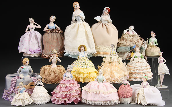 A COLLECTION OF 17 PORCELAIN HALF DOLL PIN CUSHIONS, EARLY 20TH CENTURY. Mostly German, depicting women in various pose including holding a fan and a nude holding a hand mirror, one with crossed legs. Of various size from 3.5 inches to 8.5 inches.