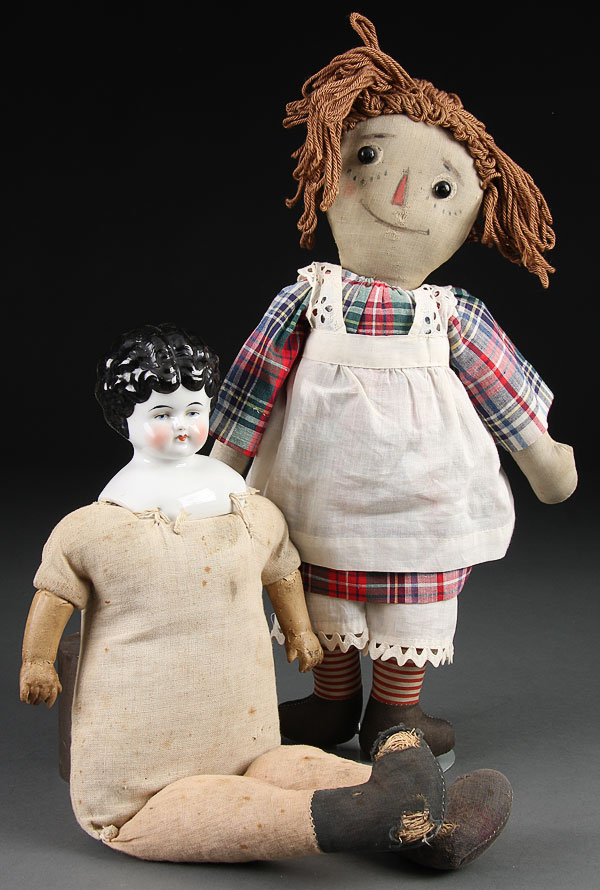 AN EARLY VOLLAND RAGGEDY ANN DOLL, CIRCA 1915, with button eyes and painted features, twisted yarn hair probably replaced. Replaced clothing. Length 16 inches. Together with a 19th century German porcelain head doll with cloth body.