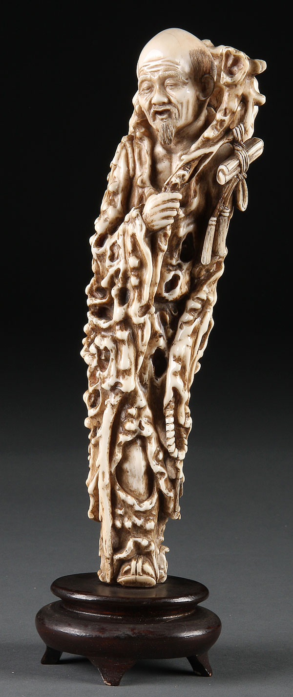 A VERY FINE JAPANESE CARVED IVORY LOHAN, PROBABLY MEIJI PERIOD, depicted holding a staff with scrolls layered in tree bark textured robes with matching cap, raised on a carved wooden plinth. The ivory 9.75 inches tall (25 cm).