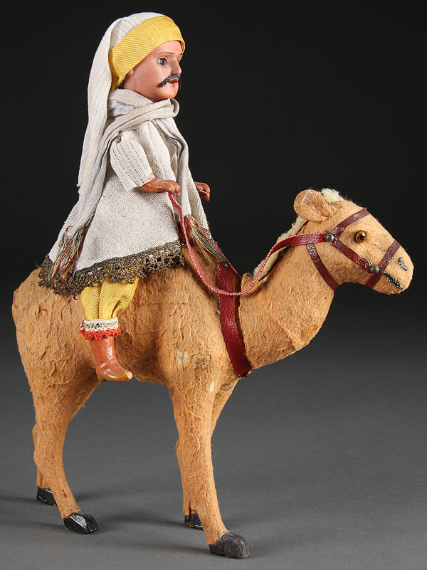 A RARE GERMAN ARAB BOY ON CAMEL CANDY CONTAINER, EARLY 20TH CENTURY. The felt covered papier-mache camel with hollow interior and removable head surmounted by a bisque doll head figure of a young Arab boy. Height 12.5 inches