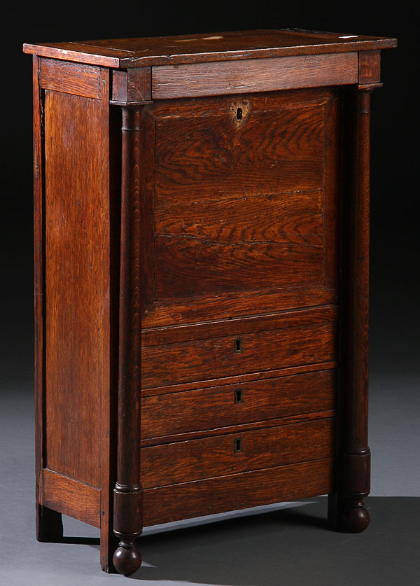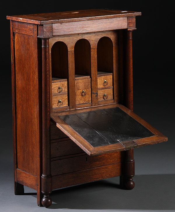 A CHILD'S OAK DROP FRONT WRITING DESK, 19TH CENTURY. With drop front writing top opening to reveal three arched top pigeon hold compartments with pencil drawers above three stationary or tablet drawers. Height 28 inches.
