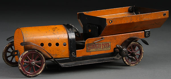 A STRUCTO TOYS TIN WIND-UP DUMP TRUCK, with orange and black enameled finish. Length 12.5 inches.