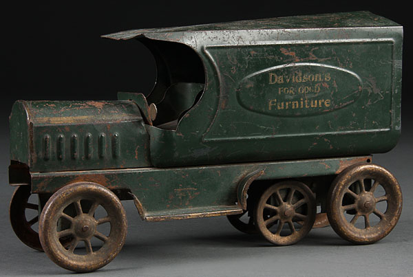 A DAVIDSON'S FURNITURE (WATERLOO, IA) TOY HILL CLIMBER DELIVERY TRUCK, EARLY 20TH CENTURY. Damaged fly wheel. Length 12 inches.