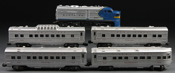 LIONEL PASSENGER CARS postwar #2434 (two), 2436 and 2432 red letter cars together with a 8351 engine.