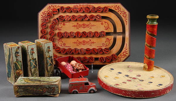 A VINTAGE CARVED WOOD MARBLE GAME, EARLY 20TH CENTURY. Together with a lithograph wood spelling toy with movable letters patented 1886, four lithograph paper building blocks, a Slik toy wagon, Dinky delivery van, two bisque babies and a bag of contemporary marbles. The largest 13.5 inches in length.