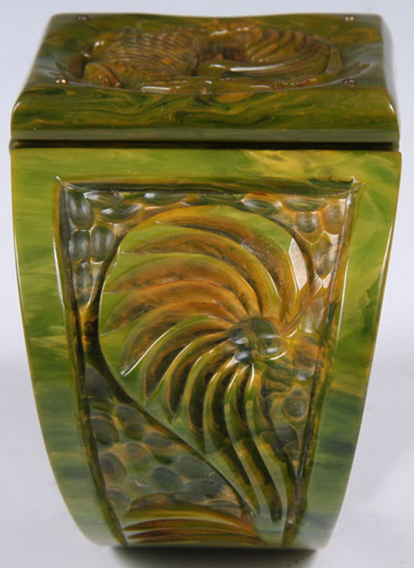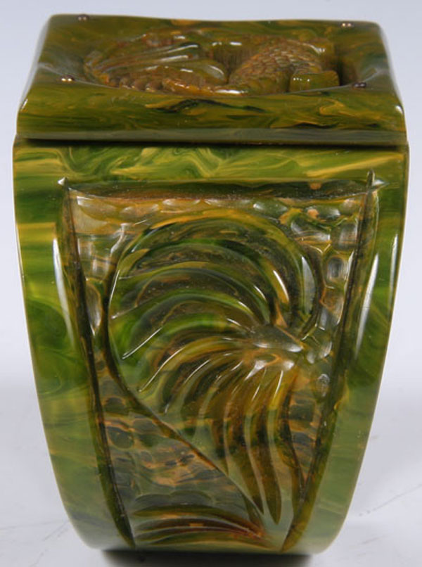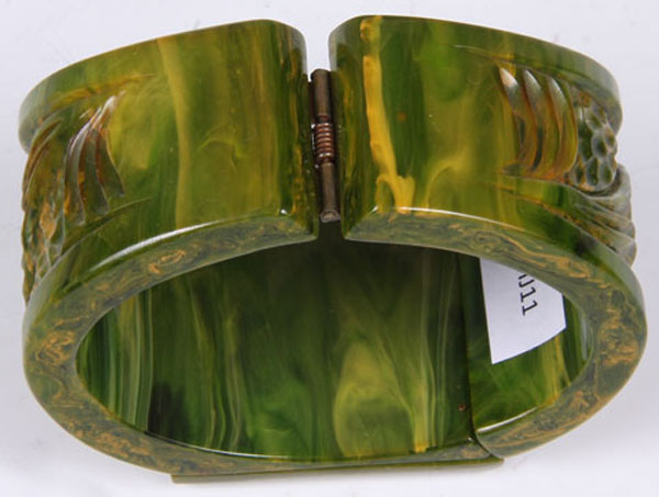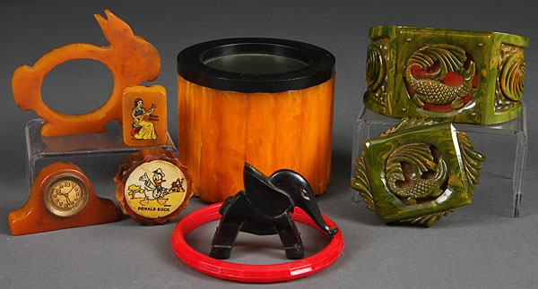 A VINTAGE BAKELITE NOVELTY AND JEWELRY GROUP, EARLY 20TH CENTURY. Comprising a rabbit napkin holder, a fluted decorative circular pedestal, Donald Duck and Snow White pencil sharpeners, a clock form pencil sharpener, a green carved bangle and matching brooch; together with a red plastic bangle and a black plastic elephant.