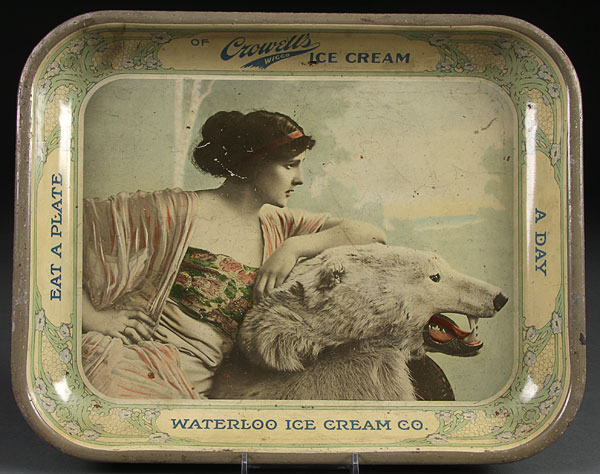 A CROWELL'S WATERLOO ICE CREAM CO. LITHOGRAPH ADVERTISING SERVING TRAY, depicting a young beauty with polar bear rug. Length 13.25 inches.