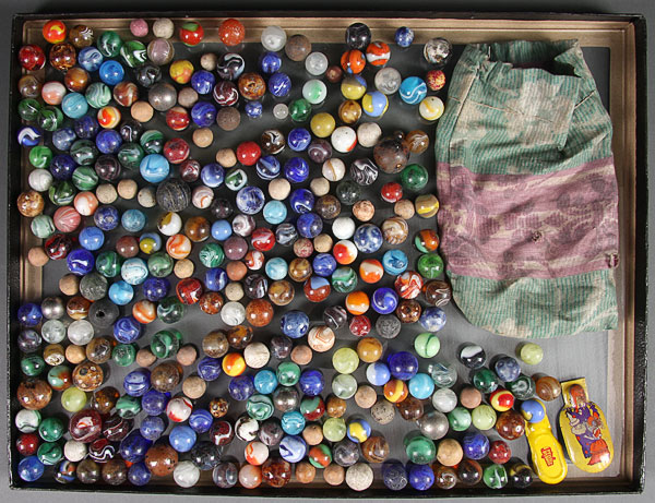A COLLECTION OF 255 VINTAGE MARBLES, mostly glass comprising various colored swirls, latticinio, onion skin, agates; together with some Benningtons and Chinese porcelain.