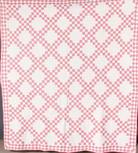 A VERY FINE PIECED AND HAND STITCHED QUILT, EARLY 20TH CENTURY. With red and white checked lattice pattern. 65 inches x 72 inches.