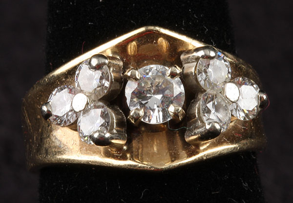 A GOOD LADIES DIAMOND AND 14K YELLOW GOLD RING, LAST HALF 20TH CENTURY. Containing seven brilliant cut round diamonds, the center diamond approximately .33 ct and six side diamonds of approximately .10-.15 ct each, of approximately VS quality and good color. Contained in a concave setting. Stamped 14K. Size 4 3/4-5.