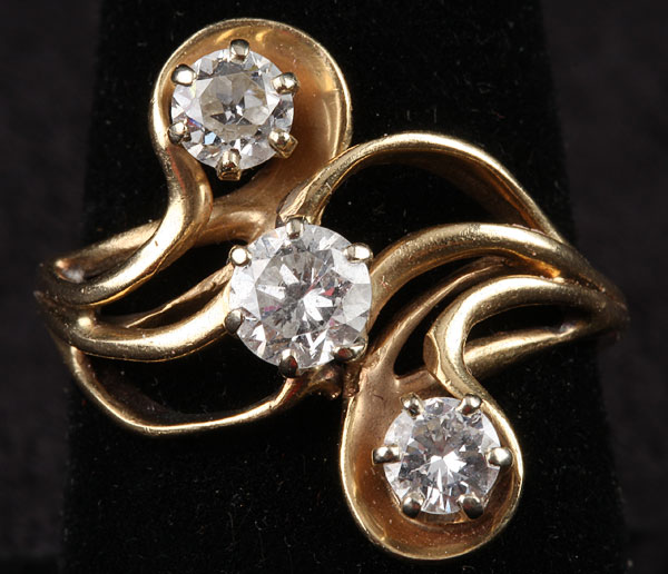 A GOOD LADIES THREE DIAMOND AND 14K YELLOW GOLD COCKTAIL RING, LAST HALF 20TH CENTURY. Containing an approximately .50 ct and .33 ct brilliant round cut diamonds of SI clarity and good color. In a scrolled setting stamped REGO 14KP. Size approx. 8 1/4.