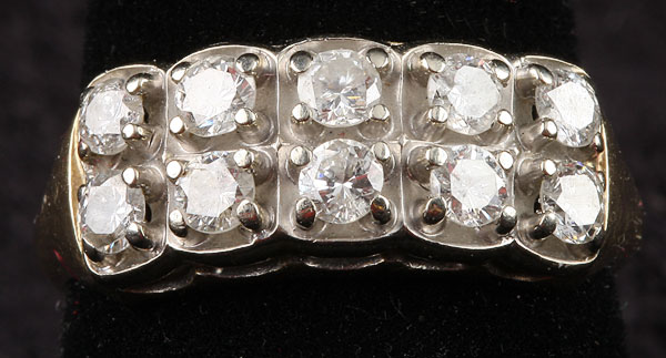 A LADIES 10 DIAMOND AND 14K YELLOW GOLD RING, MID 20TH CENTURY. Containing 10 round brilliant cut diamonds approximately 1.5 ct each and approximately SI clarity and good color. Contained in a 14K stamped yellow gold mount. Size approx. 9 1/4.