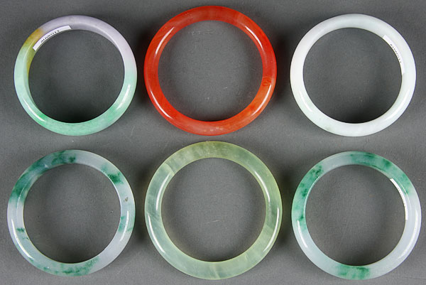 FOUR CHINESE CARVED JADEITE BANGLES, 20TH CENTURY, in pale colored jadeite with dark green mottling, together with a serpentine and carnelian colored glass bangle. Diameter 3.125 inches (8 cm).