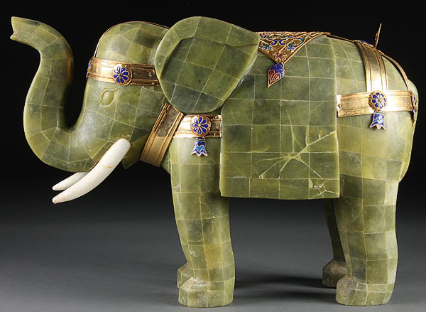 A LARGE CHINESE CARVED SERPENTINE, GILT BRONZE AND ENAMELED ELEPHANT, 20TH CENTURY, the standing elephant overlaid with carved green serpentine tiles and applied gilt bronze saddle cloth and harness with enameled scroll ornaments, the tusks in carved white soapstone. Height 12.75 inches (32.5 cm), length 19 inches (48.5 cm).