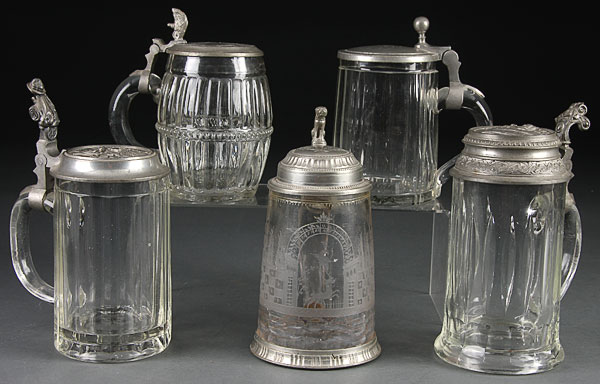 BEER STEINS, A GROUP OF FIVE GERMAN GLASS AND PEWTER BEER STEINS, MID TO LATE 19TH CENTURY. Including a very fine early cut and etched glass stein with pewter lid, base and figural dog thumb piece; a paneled stein with embossed hunting theme lid and others. Two with embossed crown marks on base. The largest 8.25 inches (21 cm).