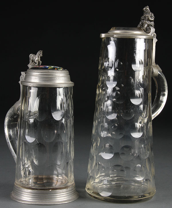 BEER STEIN, A GERMAN CUT GLASS BEER STEIN AND JUG, 19TH CENTURY. The large stein with thumbprint cut design and pewter lid containing a painted porcelain disc of a chamois with edelweiss and figural horse thumb piece; together with a thumbprint pattern jug with pewter lid, bevel cut glass disc and figural gnome thumb piece. Height 10.25 inches (26 cm) to 14 inches (34.5 cm)