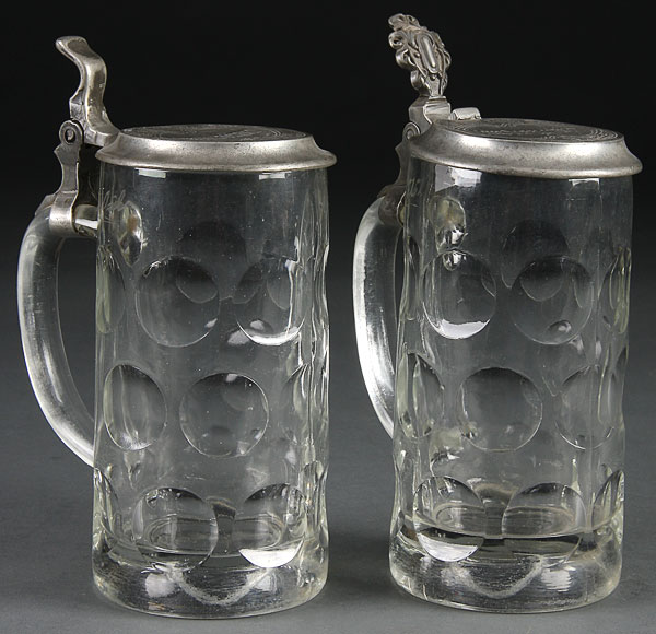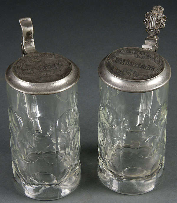 BEER STEINS, A PAIR OF JEWISH GERMAN GLASS AND PEWTER BEER STEINS, with embossed thumbprint pattern and embossed pewter lids with Star of David, each named to Josef Dafelmeier. Height 8.25 inches (21 cm).