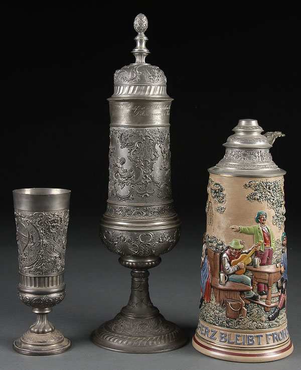 A LARGE GERMAN POLYCHROME EMBOSSED STONEWARE BEER STEIN, CIRCA 1900. Depicting a beer garden drinking scene together with a large presentation pokal with embossed scene of Augsburg and an embossed Austrian footed tumbler with Imperial eagle medallion and Rococo designs. Height 8 inches (20 cm) to 17 inches (43 cm).