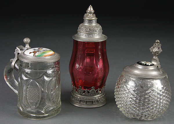 BEER STEINS, THREE GERMAN GLASS AND PEWTER MOUNTED BEER STEINS, MID TO LATE 19TH CENTURY. Comprising two early blown mold pattern glass steins with porcelain mounted lids of a humorous equestrian scene and edelweiss florals. Together with a later ruby red and clear handled stein 6 inches (14.5 cm) to 8.75 inches (22 cm).