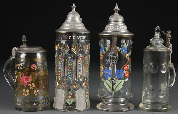 BEER STEINS, FOUR GERMAN OR AUSTRIAN GLASS AND PEWTER MOUNTED BEER STEINS, 19TH/ 20TH CENTURY. Including an early floral painted stein with acorn thumb piece, a pattern glass with gilt and enameled decoration, an enameled floral named and dated 1926 and a small thumbprint cut with figural thumb piece of a cavalier. Height 6.5 inches (16.5 cm) to 19.75 inches (25 cm).