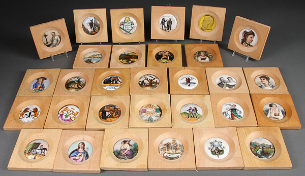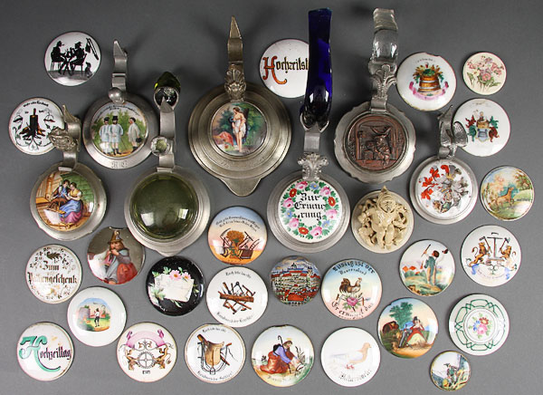 BEER STEIN LID INSERTS, A COLLECTION OF 63 GERMAN PORCELAIN STEIN LID INSERTS, the majority hand painted or transfer decorated. Depicting various scenes including romantic, humorous, hunting and religious with some portraits and occupational. Of various size, the majority 3 inches diameter (7.5 cm).