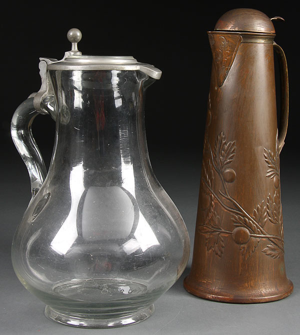 A LARGE GERMAN OR AUSTRIAN BLOWN GLASS AND PEWTER MOUNTED JUG, of baluster form with squat bulbous base, applied glass handle and pewter lid with glass insert together with an arts and crafts embossed copper jug marked GBN. Height 11.75 inches (30 cm) and 13 inches (33 cm). Together with a fine German or Austrian blown glass pewter mounted and porcelain decorated jug in topaz colored glass with porcelain inset pewter lid decorated with a handshake and inscription. Height 13.5 inches (34 cm).