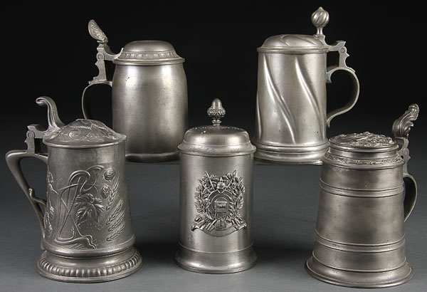 BEER STEINS, A GROUP OF FIVE GERMAN PEWTER BEER STEINS, LATE 19TH/EARLY 20TH CENTURY. Including embossed decoration in applied military armor design, named to Wolfgang Dorfler. The largest 7.25 inches (18.5 cm).