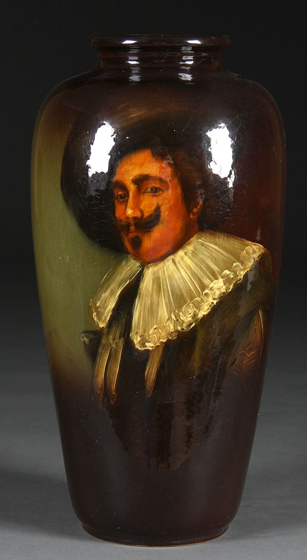 A WELLER “LOUWELSA” ART POTTERY PORTRAIT VASE, CIRCA 1900. Decorated underglaze with a portrait of a cavalier. Indistinguishably signed on verso (possibly Hester Pillsbury). Crazing and rim repairs. Incised half circle mark. Height 14.5 inches.