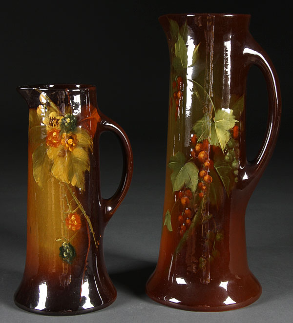 TWO ROSEVILLE ROZANE TANKARDS, CIRCA 1900. Each with hand painted berries decoration underglaze. Some crazing and flake on largest. Height 11 inches and 14.25 inches.
