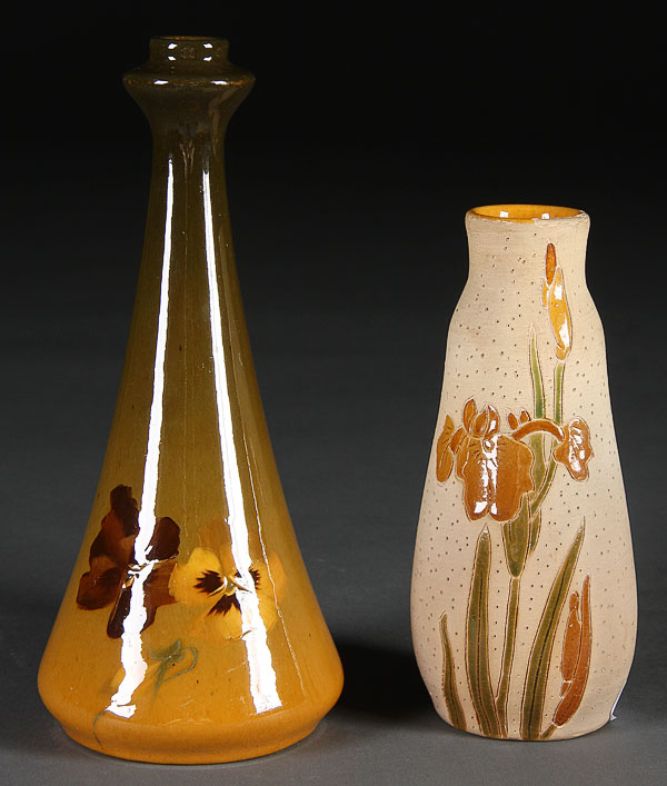 TWO ROSEVILLE ROZANE VASES, CIRCA 1900. Comprising an early woodland vase (glaze flakes) and a fine Royal bottle vase signed Grace Neff. Height 6 inches to 8.25 inches.