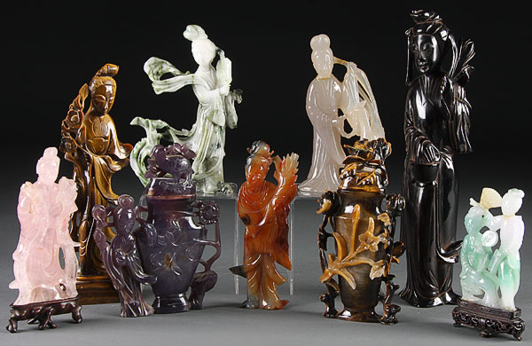 A CHINESE CARVED JADE, STONE AND AMBER QUAN YIN GROUP, 19TH/20TH CENTURY. Comprising a nephrite figure, large tiger-eye figure, rose quartz and agate figures, a large amber figure and a nephrite (repaired) together with a tiger eye lidded urn, an amethyst Quan Yin with urn and a carved glass Quan Yin (repaired). The largest 11.5 inches (29 cm).