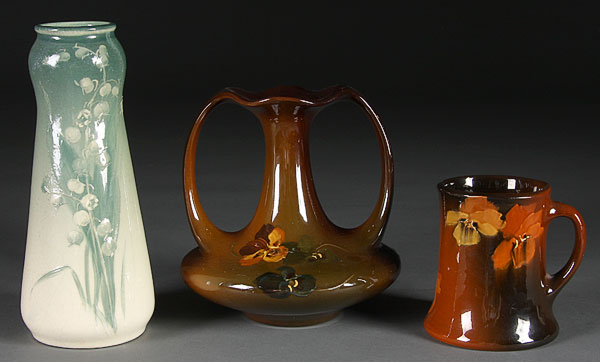 THREE ROZANE ART POTTERY PIECES, CIRCA1900. Comprising a Royal vase with lilies of the valley, a two handled vase and a handled mug. Height 4.5 inches to 9 inches.