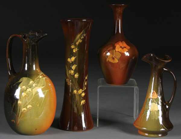 FOUR ROSEVILLE ROZANE ART POTTERY VASES, CIRCA 1900. Comprising a handled jug, ewer, bottle-vase and a cylinder vase by various artists including Gussie Gerwick and Walter Myers. Professional rim repair to bottle vase. Height 7.25 inches to 10.5 inches.