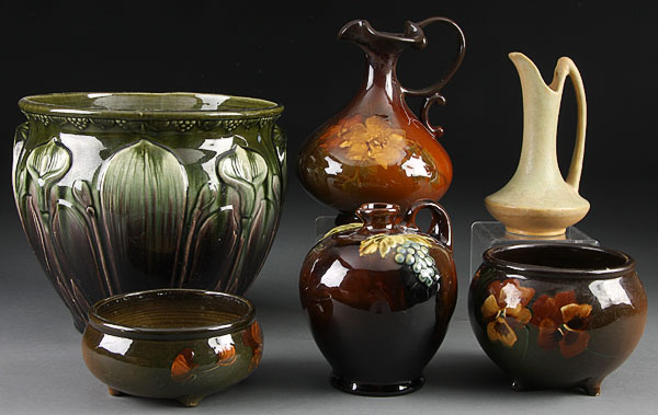 A SIX-PIECE AMERICAN ART POTTERY GROUP, CIRCA1900. Comprising an embossed calla lily jardinière, McCoy footed vase, Peters & Reed wine jug, Rozane ewer (repaired), unmarked low bowl and a Niloak handled vase/ewer. Height 2.5 inches to 8.5 inches