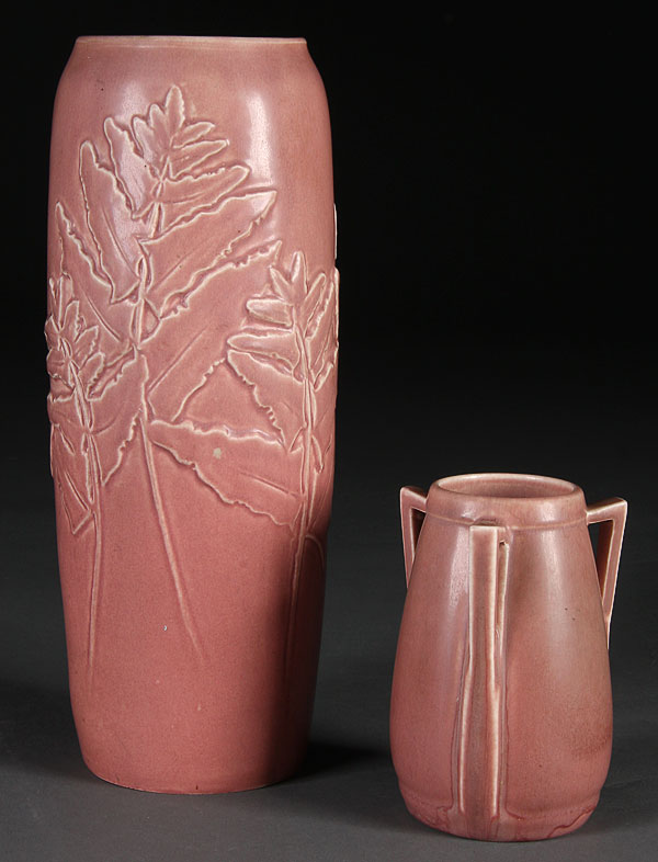 TWO ROOKWOOD ART POTTERY VASES, EARLY 20TH CENTURY. In plum mat glaze. Comprising an 11.5 inch embossed leaf dated 1920, shape #2482; and a three-handled vase dated 1926, shape #2330. Height 5 inches.