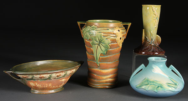 A FOUR-PIECE ROSEVILLE DAHLROSE, THORNAPPLE, LUFFA AND WINCRAFT GROUP, FIRST HALF 20TH CENTURY. Comprising a Dahlrose two-handled planter, Thornapple #808, Luffa two-handled vase and Wincraft #281 (chip). Height 3 inches to 8.5 inches.