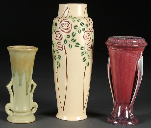 A THREE-PIECE ROSEVILLE VELMOSS SCROLL, ORIAN AND CARNELIAN II GROUP, EARLY 20TH CENTURY. Height 6.5 inches to 9.75 inches.