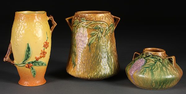 A THREE-PIECE ROSEVILLE WISTERIA AND BITTERSWEET ART POTTERY GROUP, FIRST HALF 20TH CENTURY. Comprising two Wisteria handled vases and a Bittersweet handled vase #883. Height 4 inches and 8 inches.