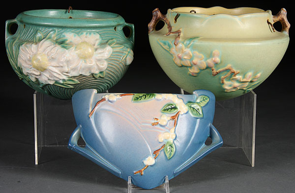 A THREE-PIECE ROSEVILLE WALL AND HANGING PLANTER GROUP, FIRST HALF 20TH CENTURY. Comprising an apple blossom and peony hanging planters and a snowberry wall pocket (hairline). Diameter 8.5 inches.