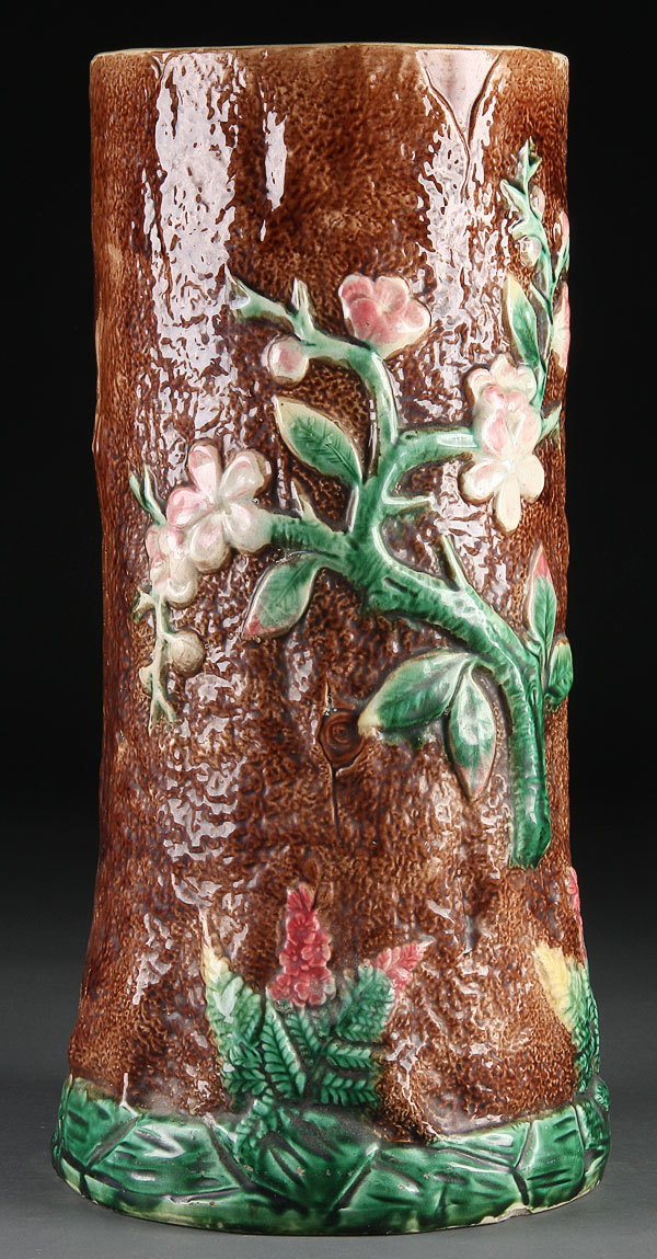 AN ENGLISH MAJOLICA UMBRELLA STAND, LATE 19TH CENTURY. With embossed cherry blossom and branch decoration on a brown tree trunk form ground. Height 20.75 inches.