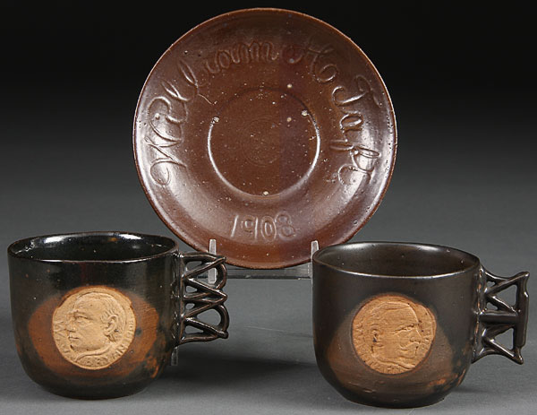 A RARE WILLIAM BRYAN AND WILLIAM TAFT 1908 POLITICAL CAMPAIGN WATERLOO POTTERY WORKS SAUCER AND TWO CUPS, EARLY 20TH CENTURY. The Albany glazed handled cup with embossed profile of William Bryan and reticulated WB form handle; together with a William Taft profile medallion cup with WT reticulated form handle and a William H. Taft 1908 embossed saucer. Each piece with embossed Waterloo, IA pottery name and logo. Diameter 4.75 inches.