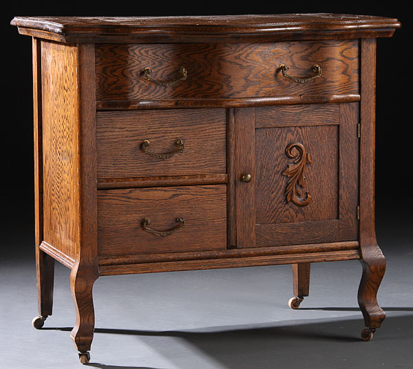 A VICTORIAN OAK COMMODE, with serpentine top drawer and applied decoration. Height 30 inches, width 31.5 inches, depth 19.75 inches.