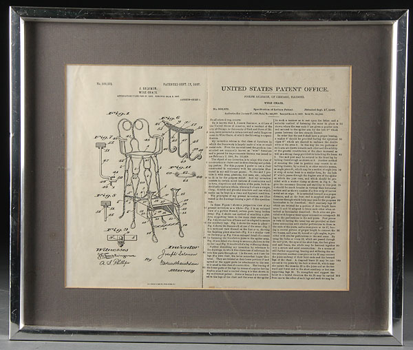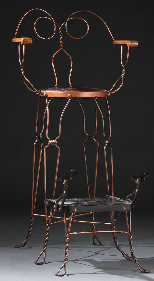 A VICTORIAN BENT WIRE SHOE SHINE STAND/CHAIR, CIRCA 1900. Of bent and twisted wire form with circular seat above shaped cast iron foot rests. Lot is accompanied by a U.S. patent office reprint for the “wire chair” by J. Saloman, Chicago 1907. Height 51.5 inches.