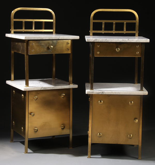 A PAIR OF ENGLISH BRASS AND MARBLE NIGHTSTANDS, CIRCA 1900. Of two-tiered form. Height 41 inches, width 17 inches, depth 16 inches.