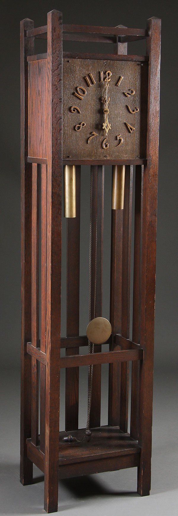 ARTS AND CRAFTS (MISSION OAK) STYLE TALL CASE CLOCK, CIRCA 1900, with oak slat joined by squared legs. Two weight with chimes. Original finish. Height 79 inches. Depth 14 inches. Width 19 inches.