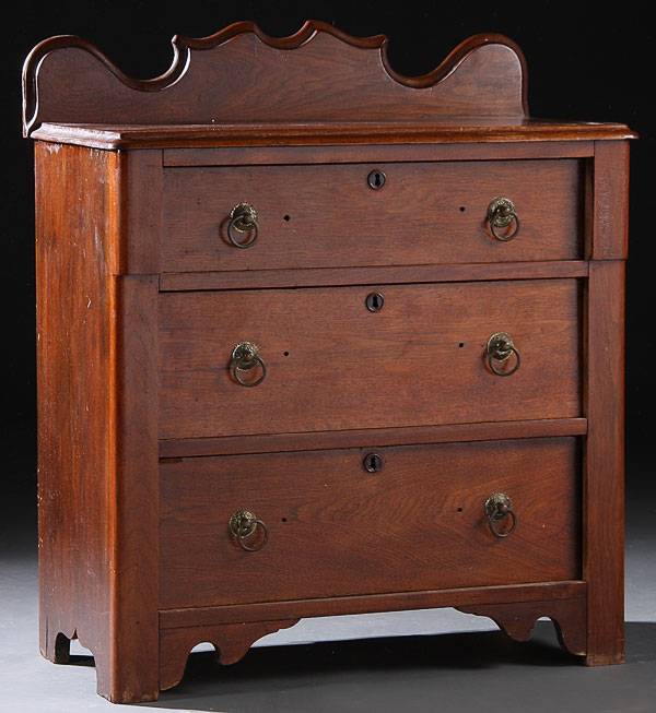 A THREE-DRAWER VICTORIAN WALNUT COMMODE. Height 35 inches, width 30 inches, depth 15 inches.