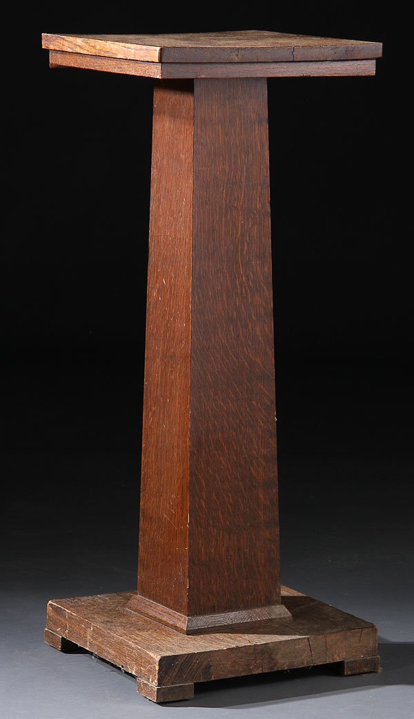 A VICTORIAN OAK FERN STAND, of square form with tapered pedestal. Height 38.25 inches.
