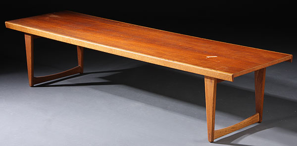 A GOOD DANISH MODERN TEAK WOOD COFFEE TABLE, CIRCA 19TH CENTURY. With matched grain top raised on square tapering legs. Apparently unmarked. Height 15.75 inches, width 71 inches, depth 19.5 inches.