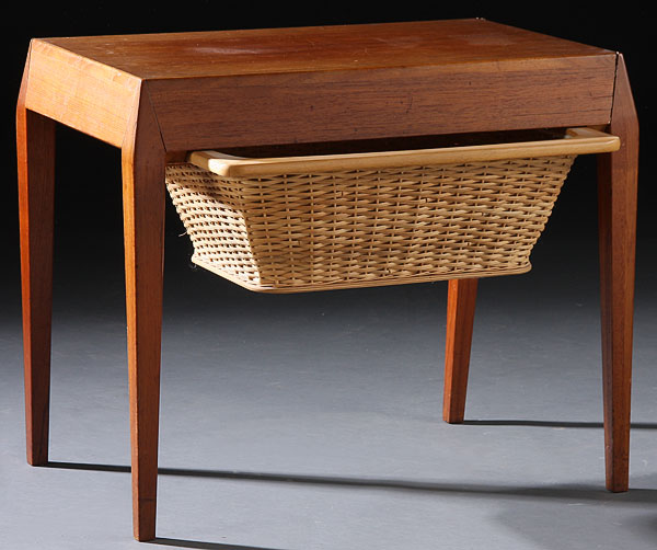 A GOOD SWEDISH MODERN GUSTAVSSONS TEAK WOOD WORK TABLE, with sliding woven wicker storage basket raised on squared tapering legs below a sliding drawer and teak wood top. Height 20 inches, width 23 inches, depth 16 inches.