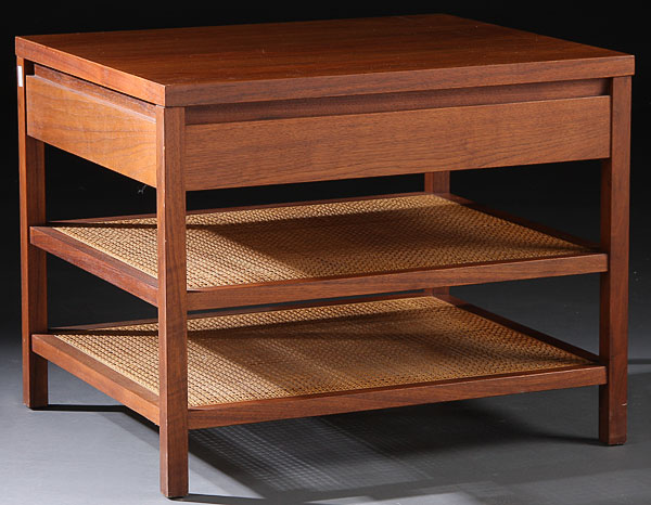 A VERY FINE PAUL MCCOBB FOR CALVIN FURNITURE CO. MODERN WALNUT LAMP TABLE, CIRCA 1960. With single drawer raised on squared legs joined by two lower woven wicker shelves. Height 19 inches, width 24 inches, depth 20 inches.